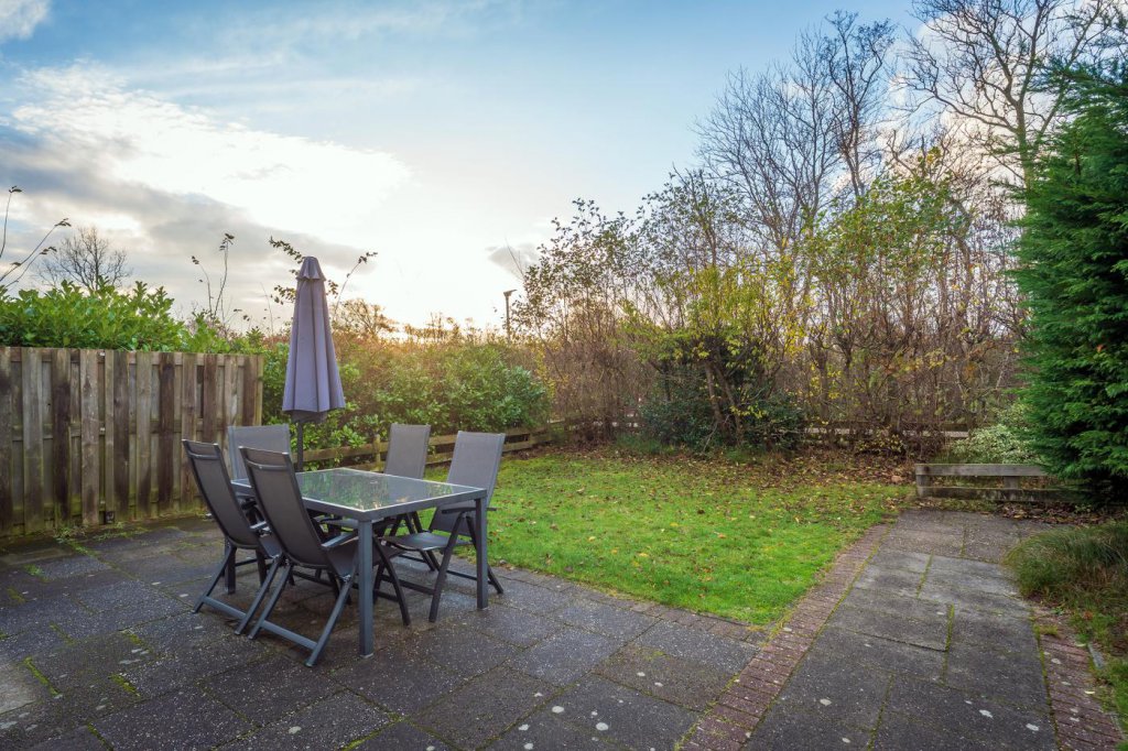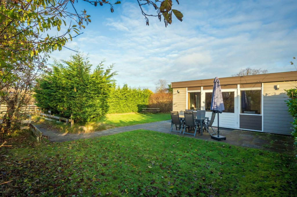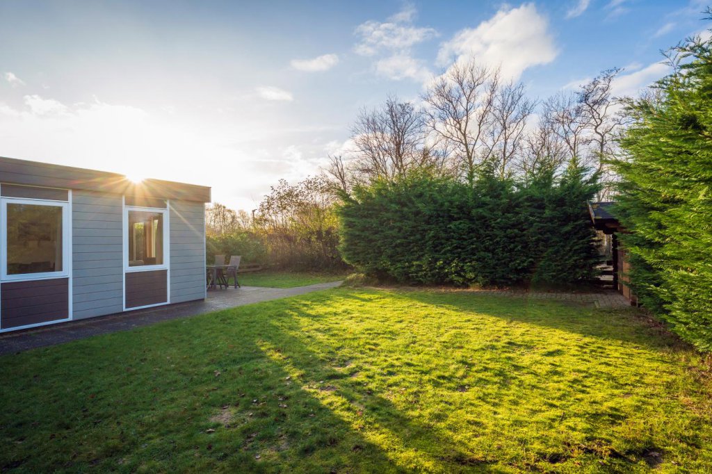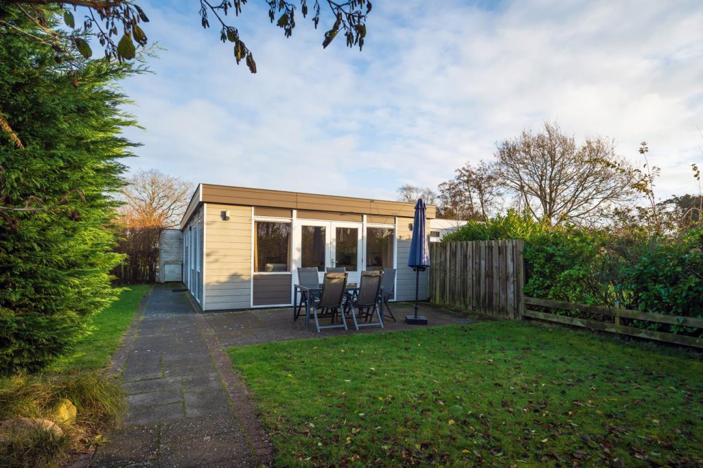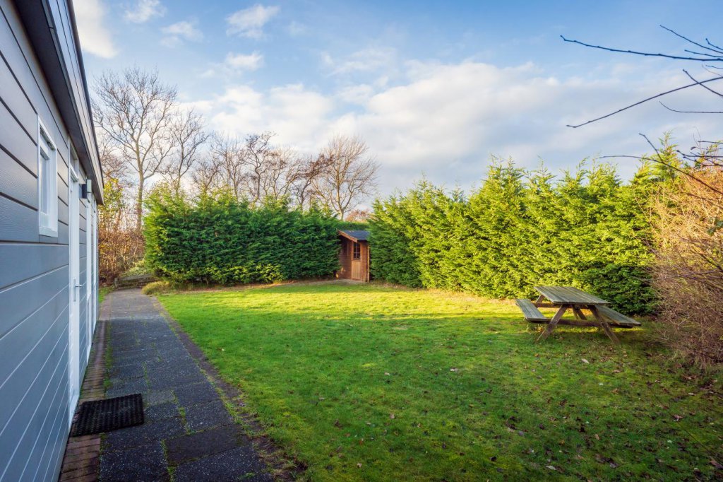 De tuin rondom de bungalow is ruim en groen aangelegd. Er is een zonnig terras waar u heerlijk kunt ontspannen, en een houten tuinberging die extra bergruimte biedt voor fietsen, tuingereedschap of strandspullen. Het perceel beschikt bovendien over twee eigen ruime parkeerplaatsen, wat het gebruiksgemak verder vergroot.