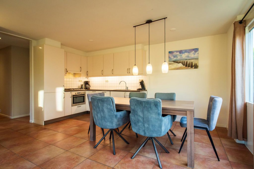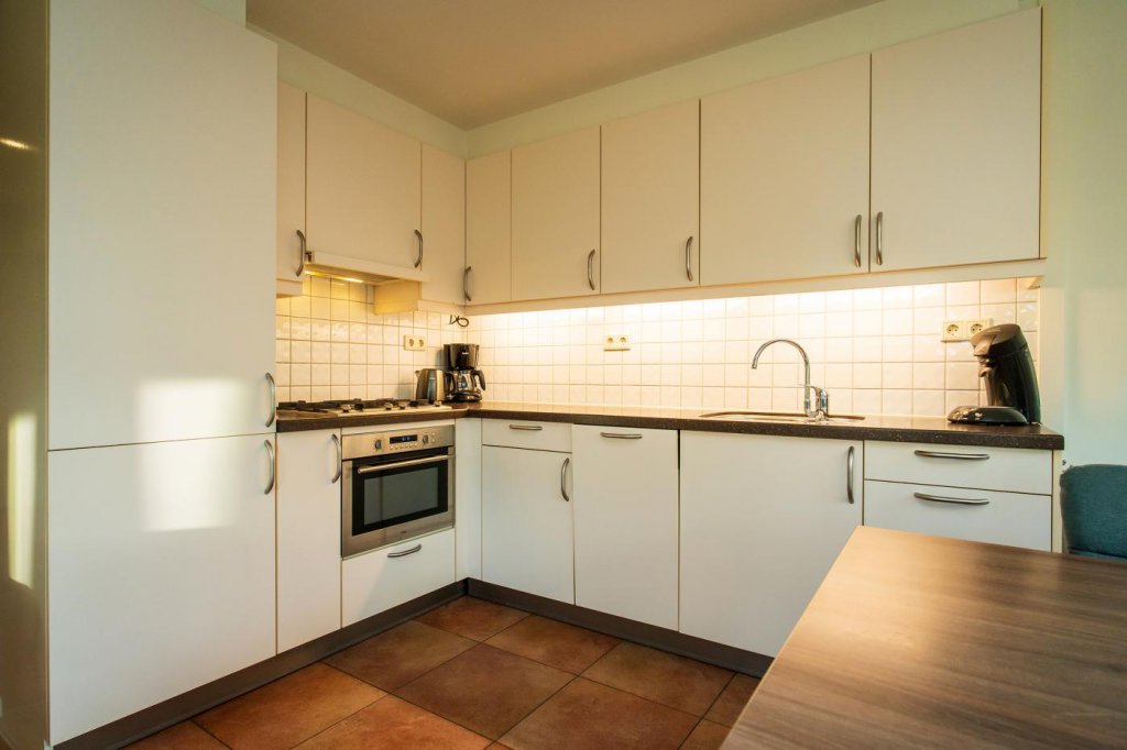 De woonkamer staat in open verbinding met de keuken, die is voorzien van diverse inbouwapparatuur. Dit maakt koken niet alleen praktisch, maar ook plezierig. De keuken sluit naadloos aan bij de moderne uitstraling van de woning.