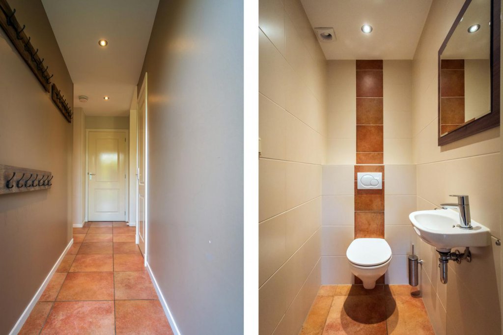 Bij binnenkomst treft u een ruime hal met toegang tot de toiletruimte, voorzien van een vrijdragende wc en een fontein. Vanuit de hal bereikt u ook de overige vertrekken van de bungalow.