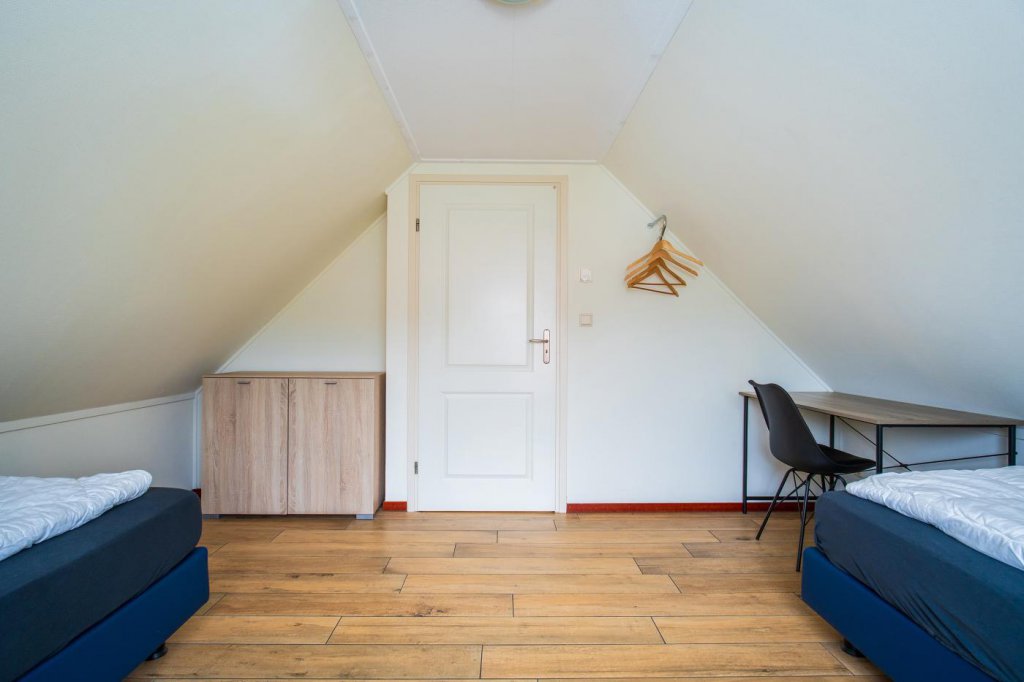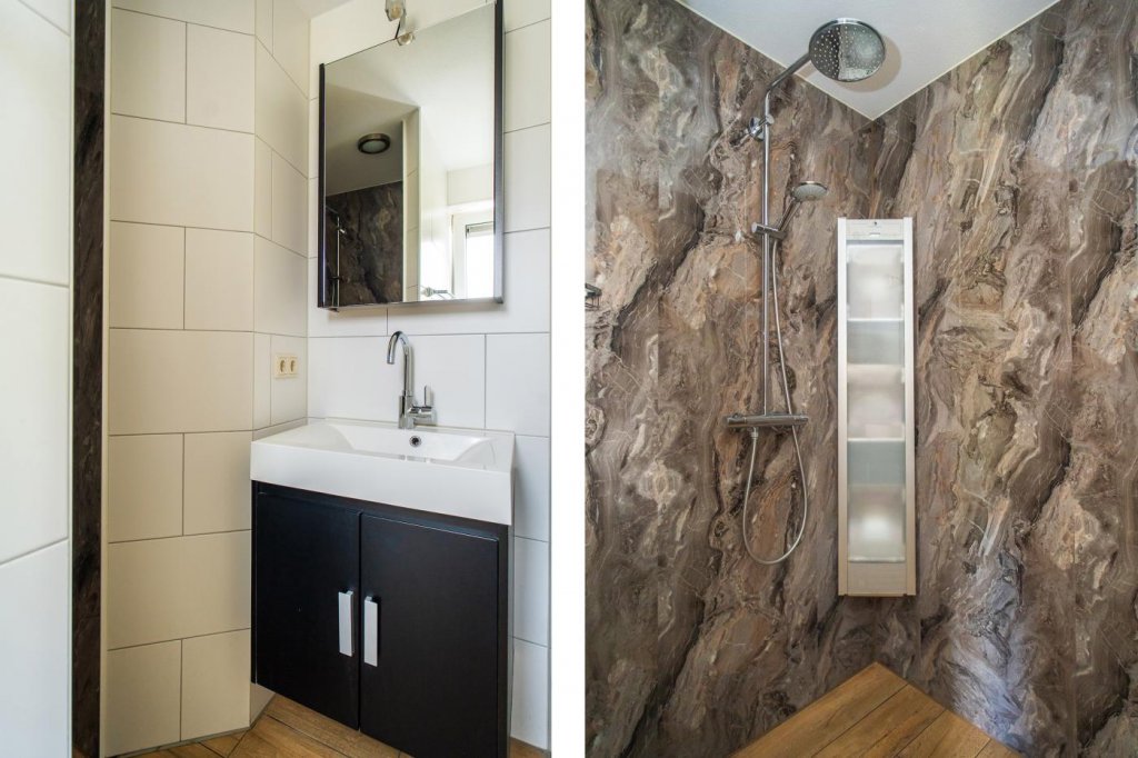 Er is een slaapkamer op de begane grond met een eigen sanitaire voorziening bestaande uit een wastafel met meubel en een inloopdouche voorzien van sunshower.