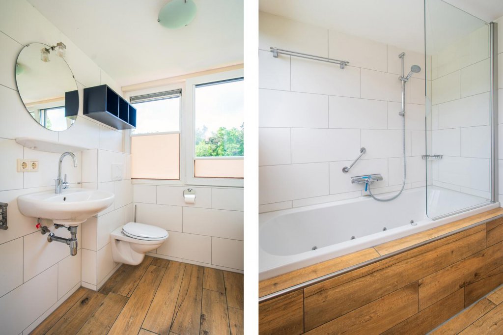 Op de eerste verdieping van de bungalow bevindt zich een overloop voorzien van een vaste kast. Verder zijn er op de eerste verdieping twee ruime slaapkamers en een badkamer aanwezig. De fraaie badkamer is gesitueerd in het dakkapel en beschikt over een ligbad (whirlpool), een vrijdragend toilet en een wastafel.