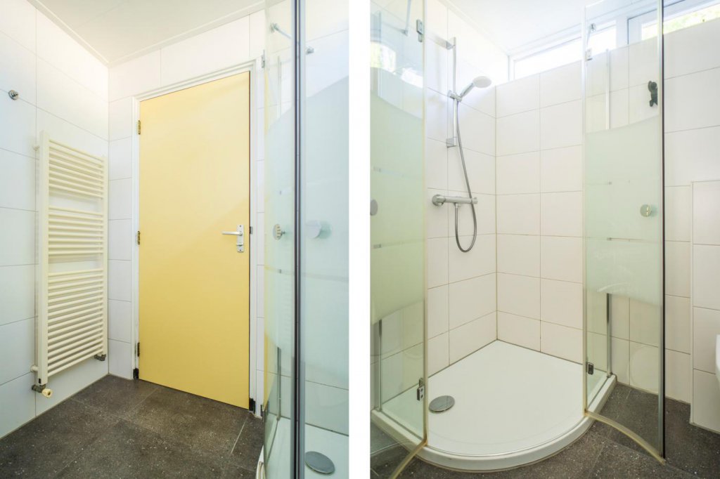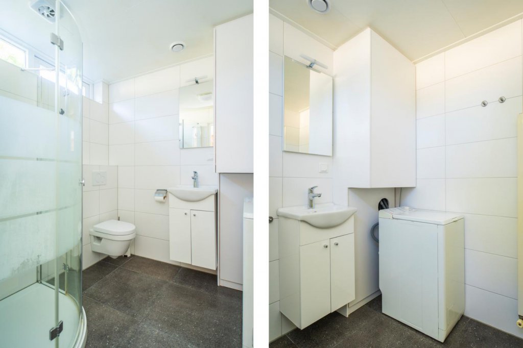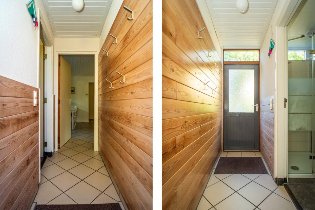 Kijkt u voor de indeling van deze vakantiewoning op de plattegrond in de verkoopbrochure. De entree is aan de zijkant en geeft toegang tot de badkamer en de woonkamer. De badkamer beschikt over een douche, een wastafelmeubel en een toilet. Ook is hier de wasmachineaansluiting. De woonkamer heeft openslaande deuren naar het terras (op het zuiden) en de tuin. Via de woonkamer is ook een van de drie slaapkamers te bereiken. De open keuken is netjes uitgevoerd en beschikt over diverse apparatuur. Vanuit de woonkamer zijn via een binnenhal met vaste kast, nog twee slaapkamers te bereiken. Beide zijn voorzien van een wastafelmeubel. Vanuit een van de slaapkamers is de sauna te bereiken (deze is in de aangebouwde berging gesitueerd). De aangebouwde berging is uitermate geschikt voor uw tuinspullen.