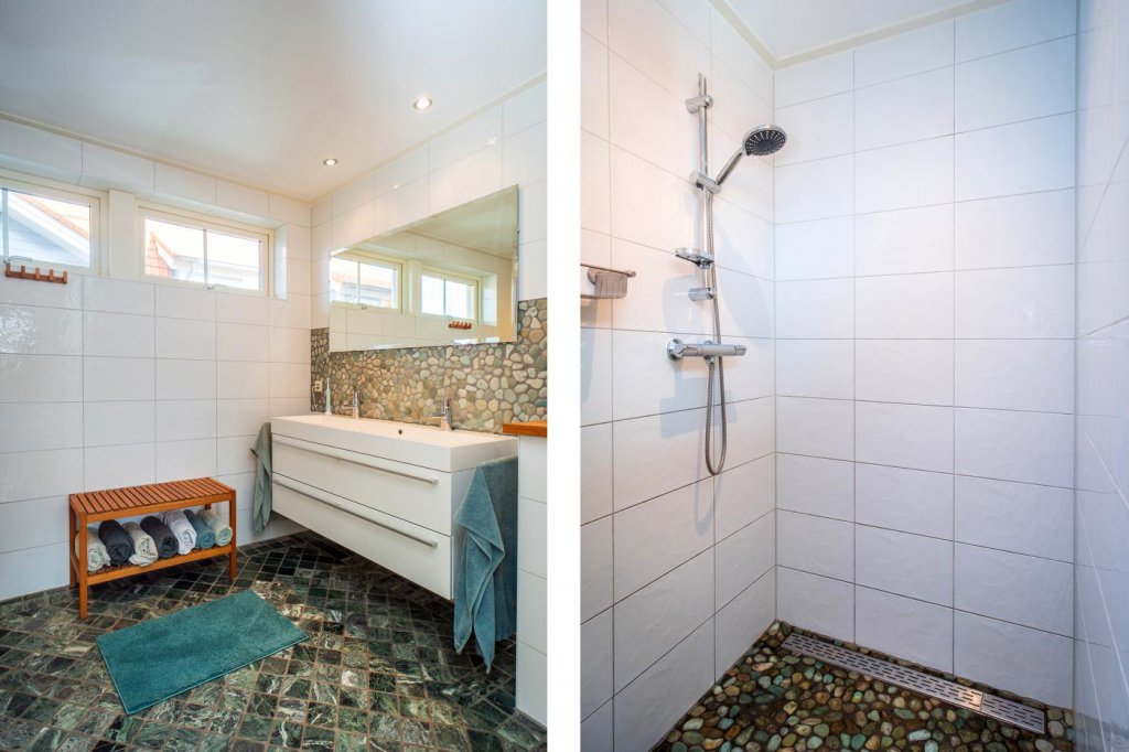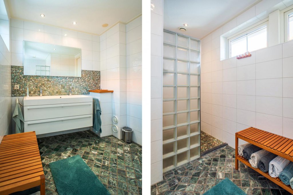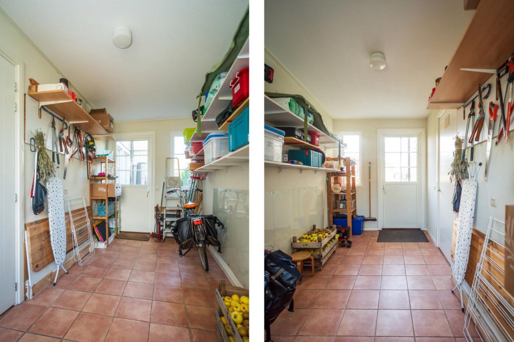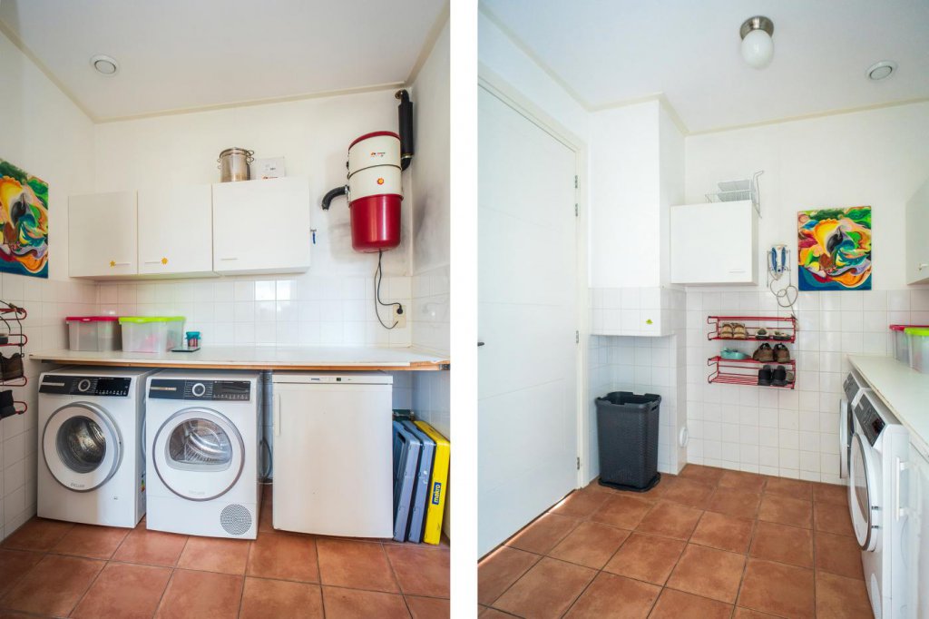 Vanuit de keuken loopt u door naar de bijkeuken met ruimte voor de witgoedapparaten en het centrale stofzuigsysteem. En kijkt u op de foto goed naar de situering van de wasmand. Deze staat onder een koker die de bovenliggende badkamer verbindt met de bijkeuken. Hoe ideaal, nooit met wasgoed de trap af. Vanuit de bijkeuken loopt u door naar de berging met aan de voor- en achterzijde een buitendeur.