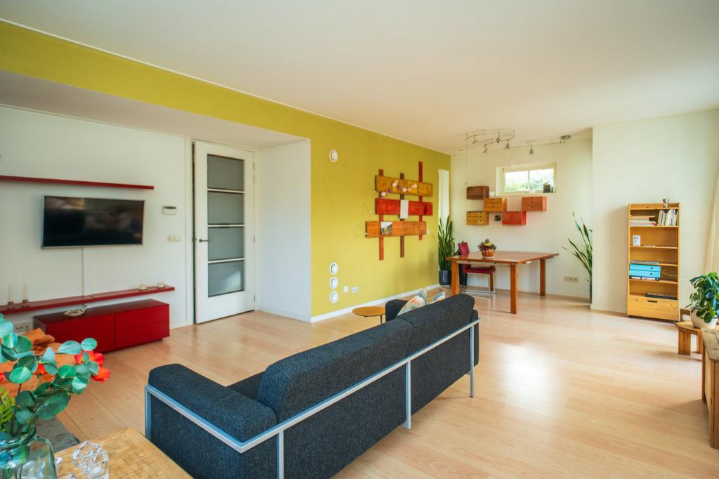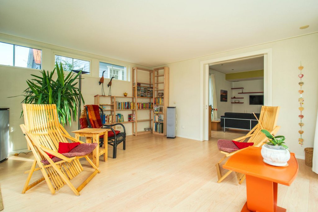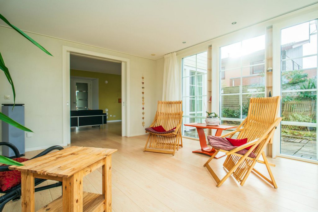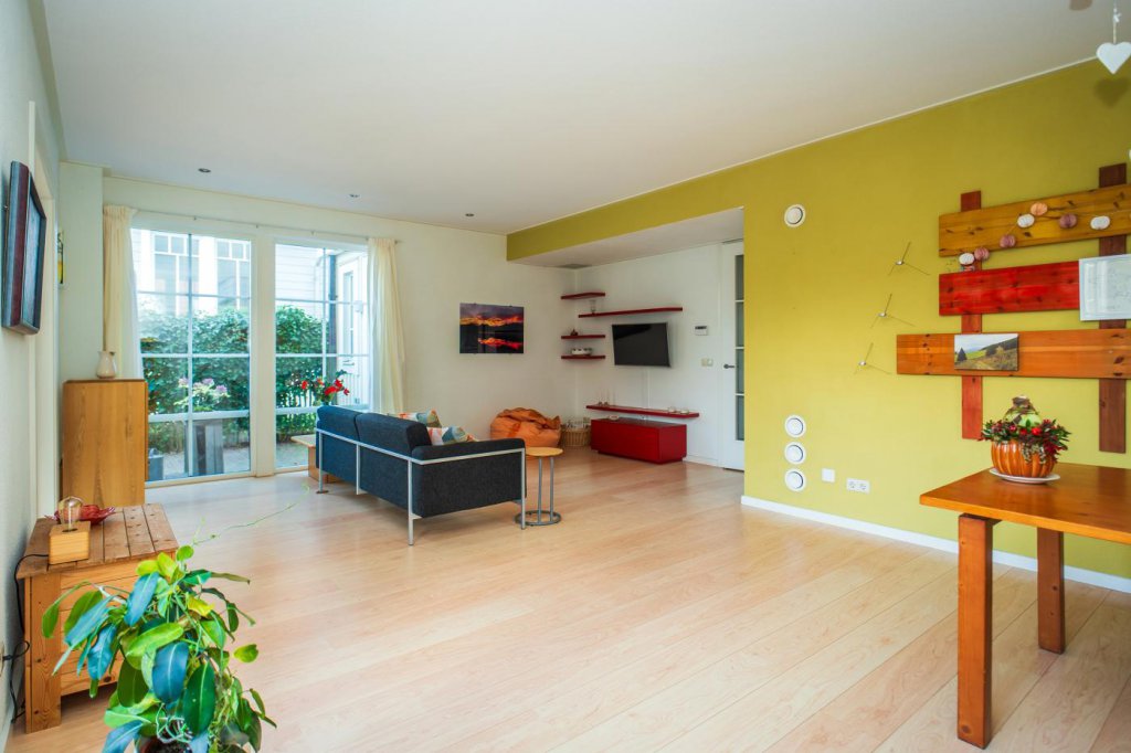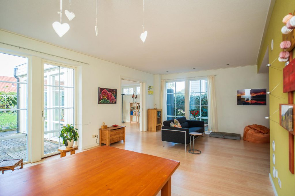 Evenals de woonkeuken is de woonkamer ruim en licht. Dit komt mede door de grote raampartijen tot aan de vloer. De woonkamer is opgedeeld in twee gedeeltes. Tussen deze twee delen zitten schuifdeuren waardoor de ruimtes tegelijkertijd voor verschillende doelen te gebruiken zijn. Vanuit beide delen van de woonkamer is er middels terrasdeuren toegang tot terras en tuin.