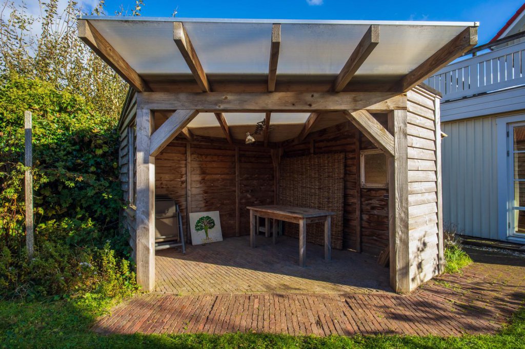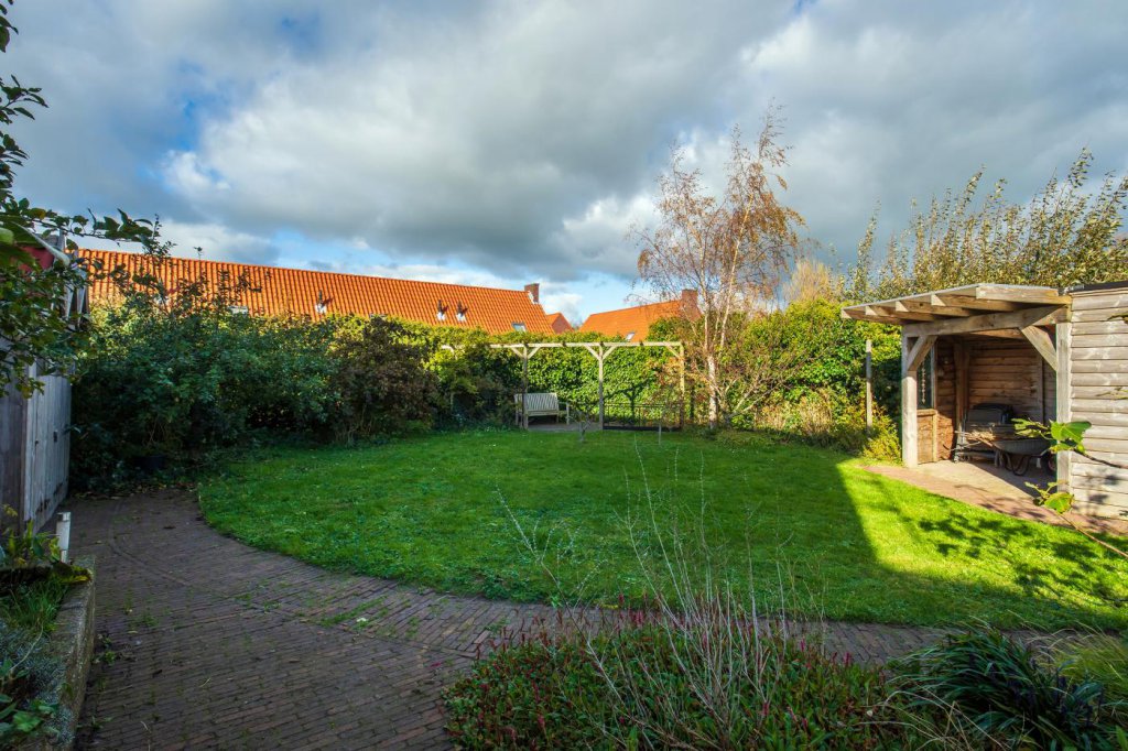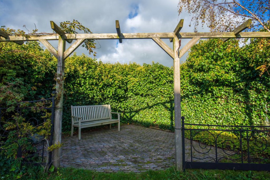 Rondom de woning ligt een onder architectuur aangelegde tuin. Zowel aan de voorzijde als aan de achterzijde wordt speelse bestrating afgewisseld door groen. Aan de voorzijde is ook een parkeerplaats op eigen terrein gerealiseerd. De achtertuin heeft een groot gazon, diverse bergruimtes, diverse zitjes en een leuke overkapping. In de zon of juist in de schaduw? Voor ieder wat wils.